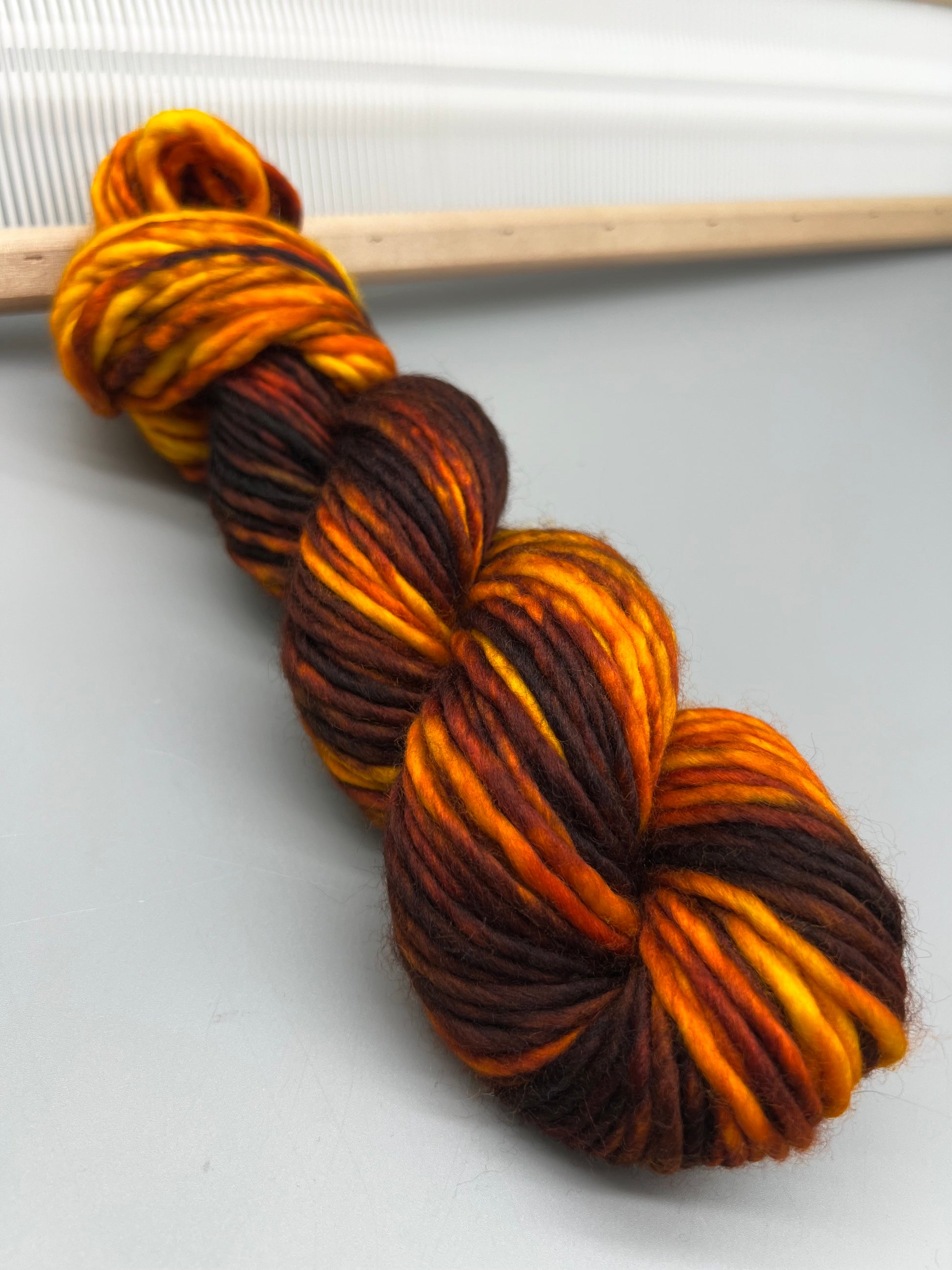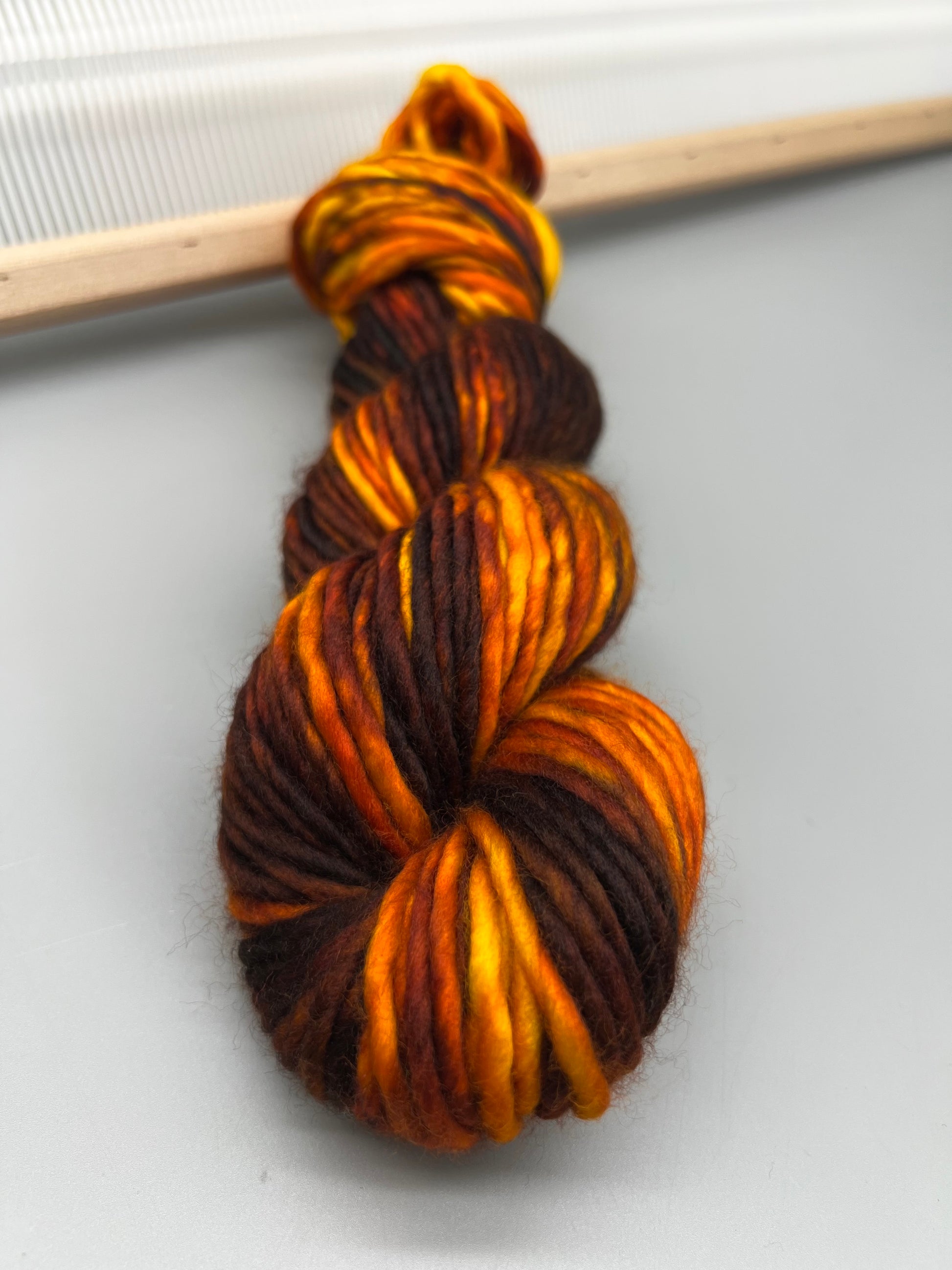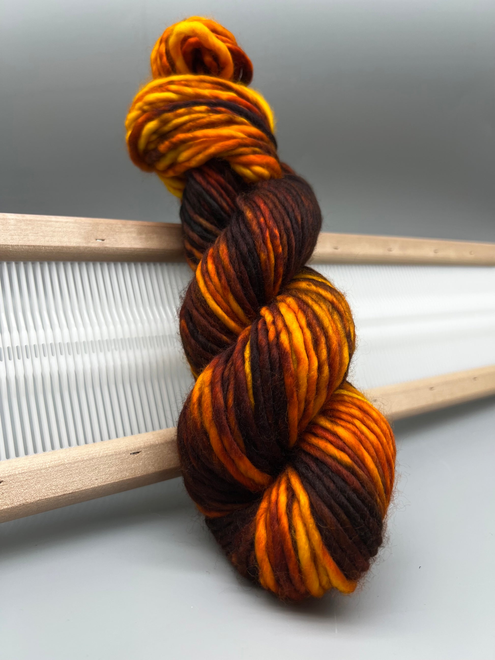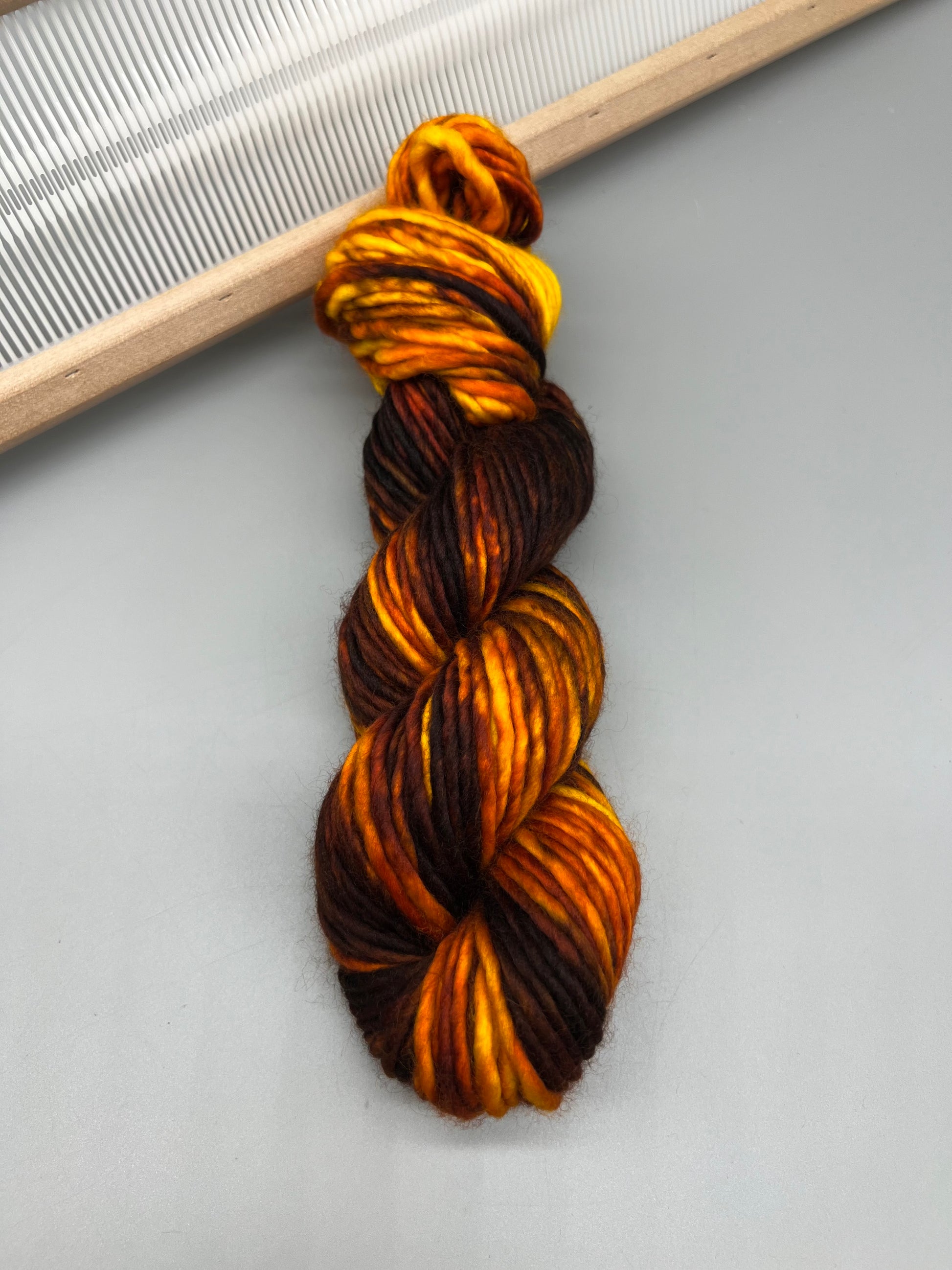 Hand dyed yarn in smoky brown, orange and yellow