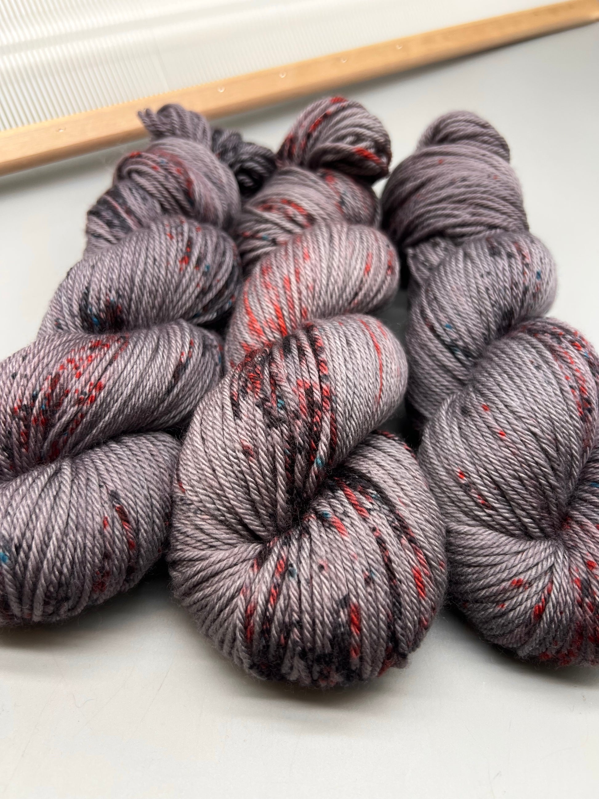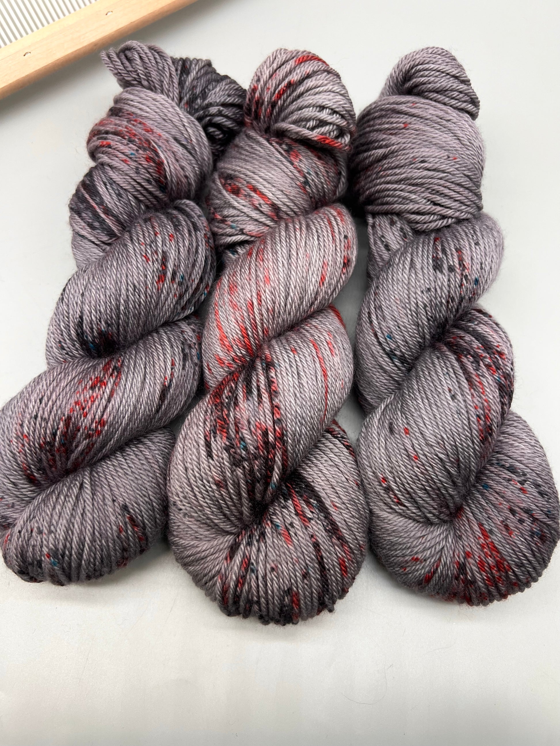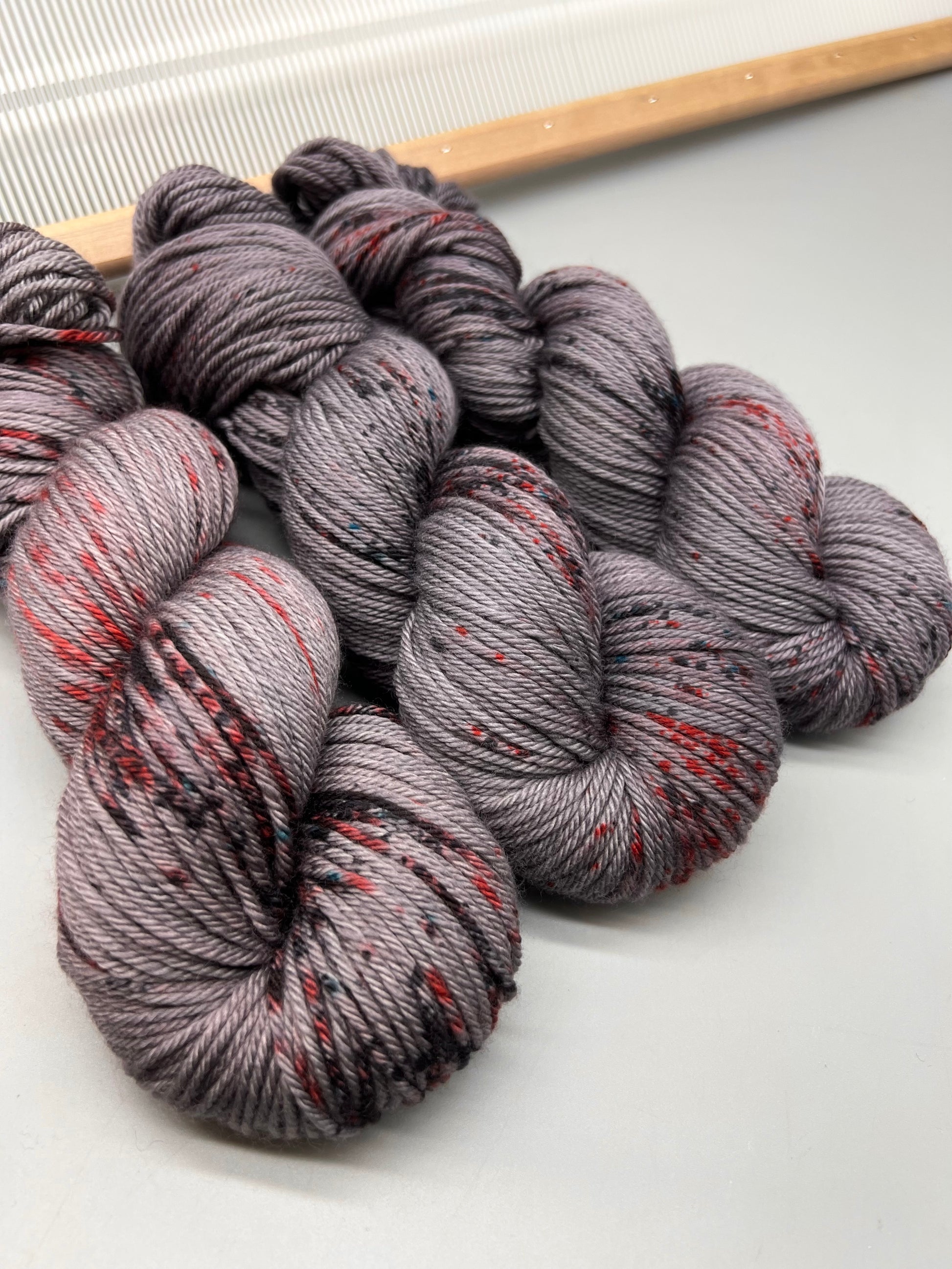 Hand dyed yarn in dark gray flecked with light red, black and the occasional blue spots. Skeins are light and dark gray toned with concentrated speckling in certain areas, not throughout.