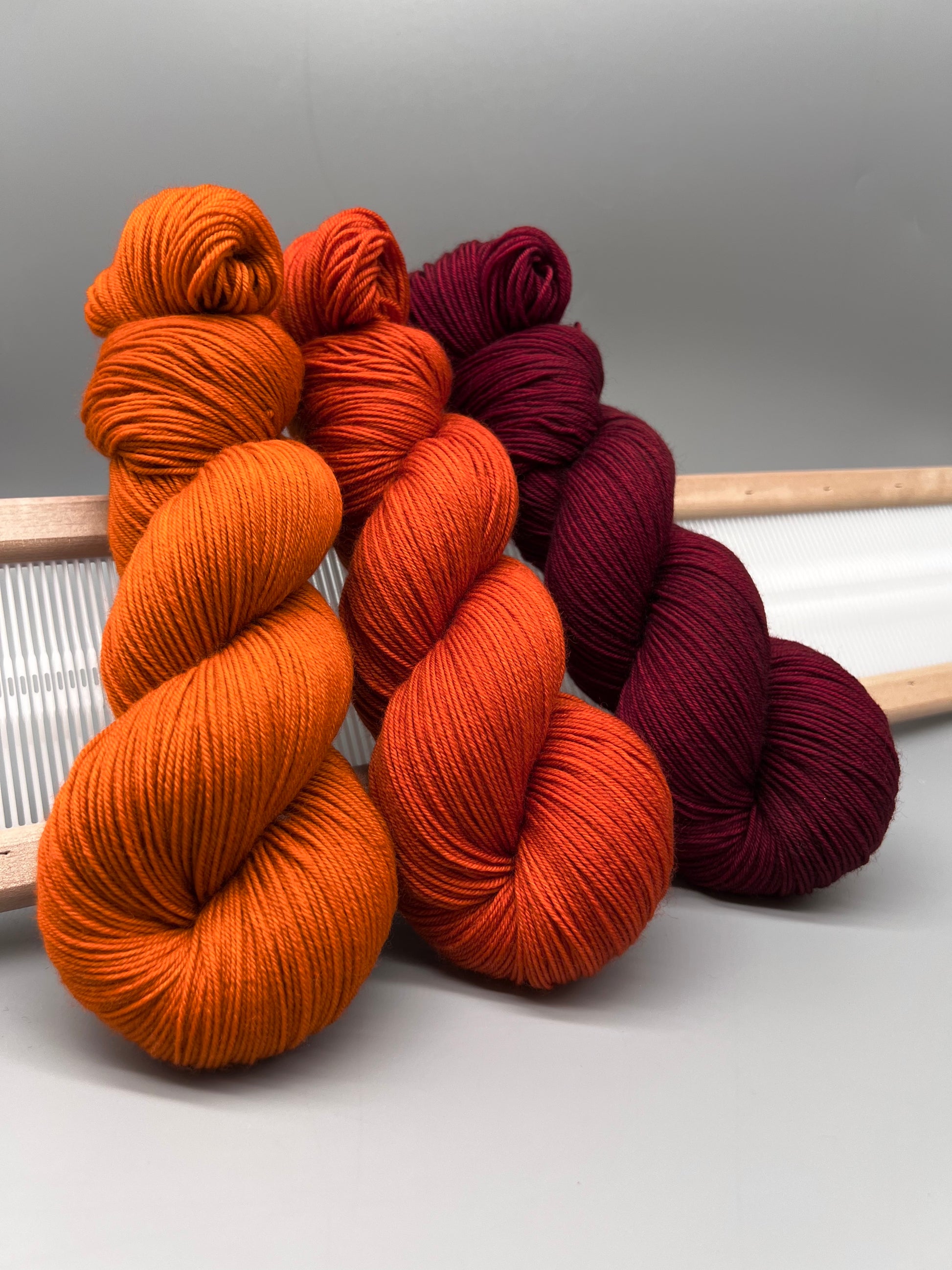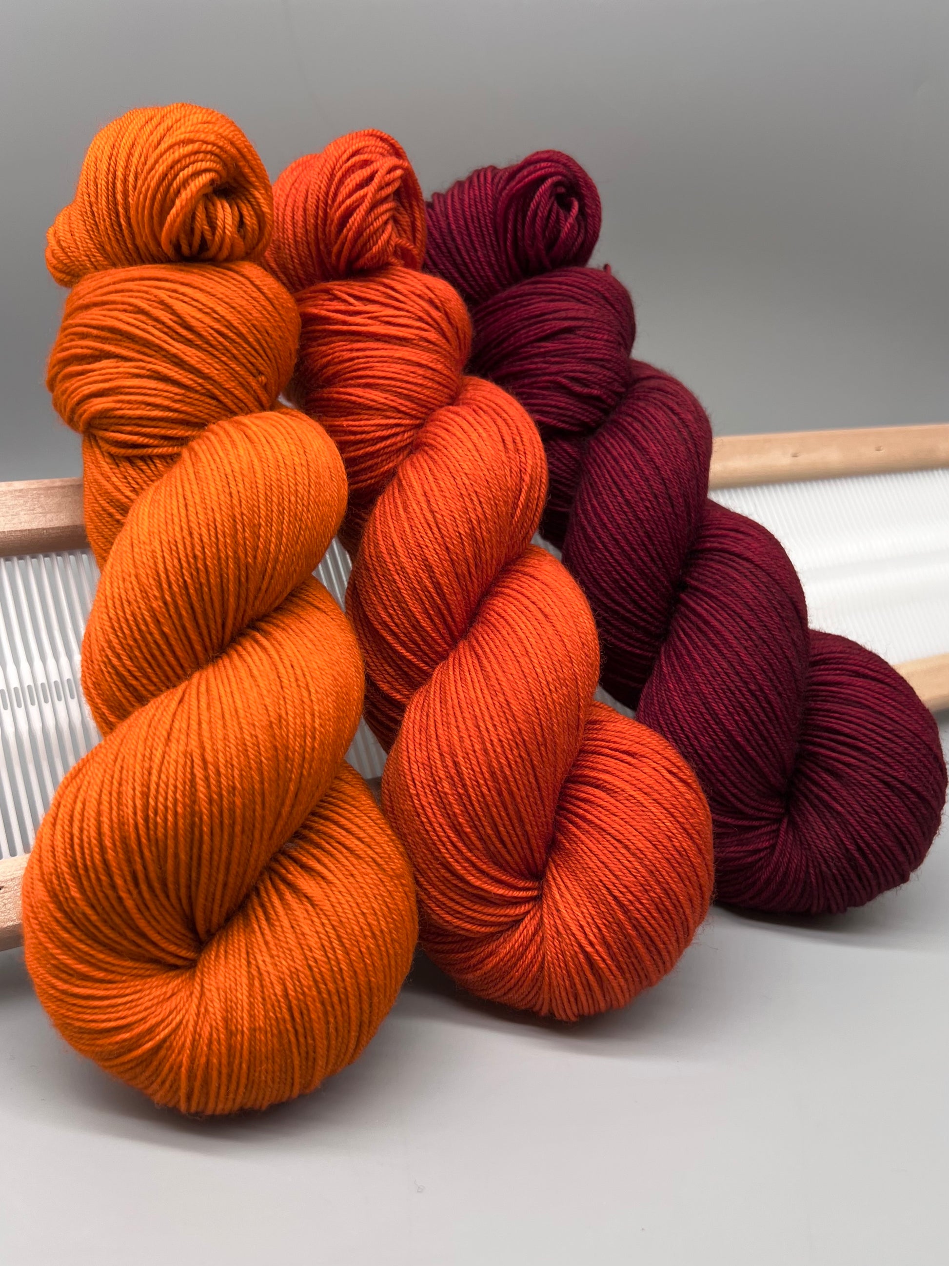 Hand dyed yarn in a red, red-orange and orange.