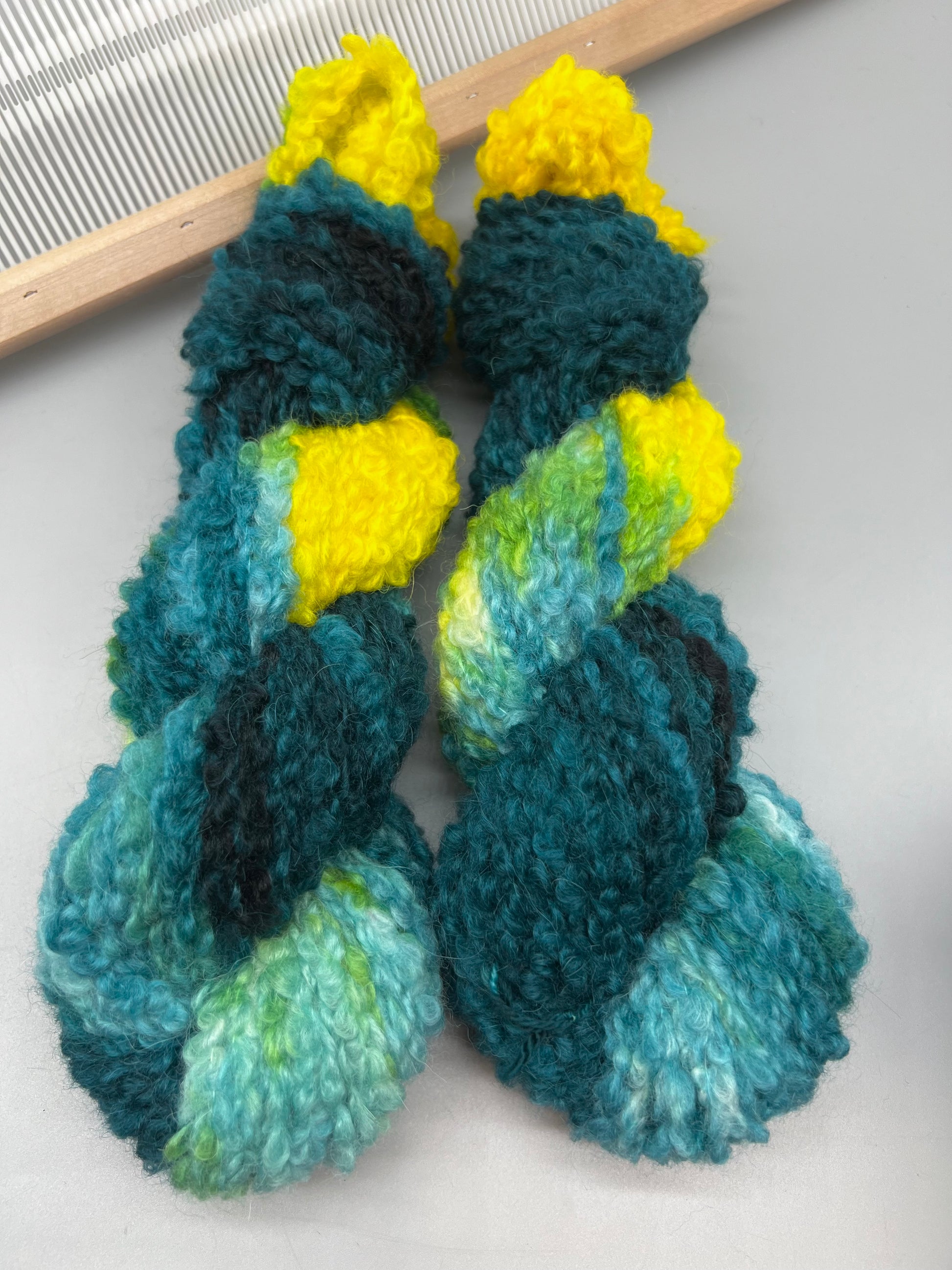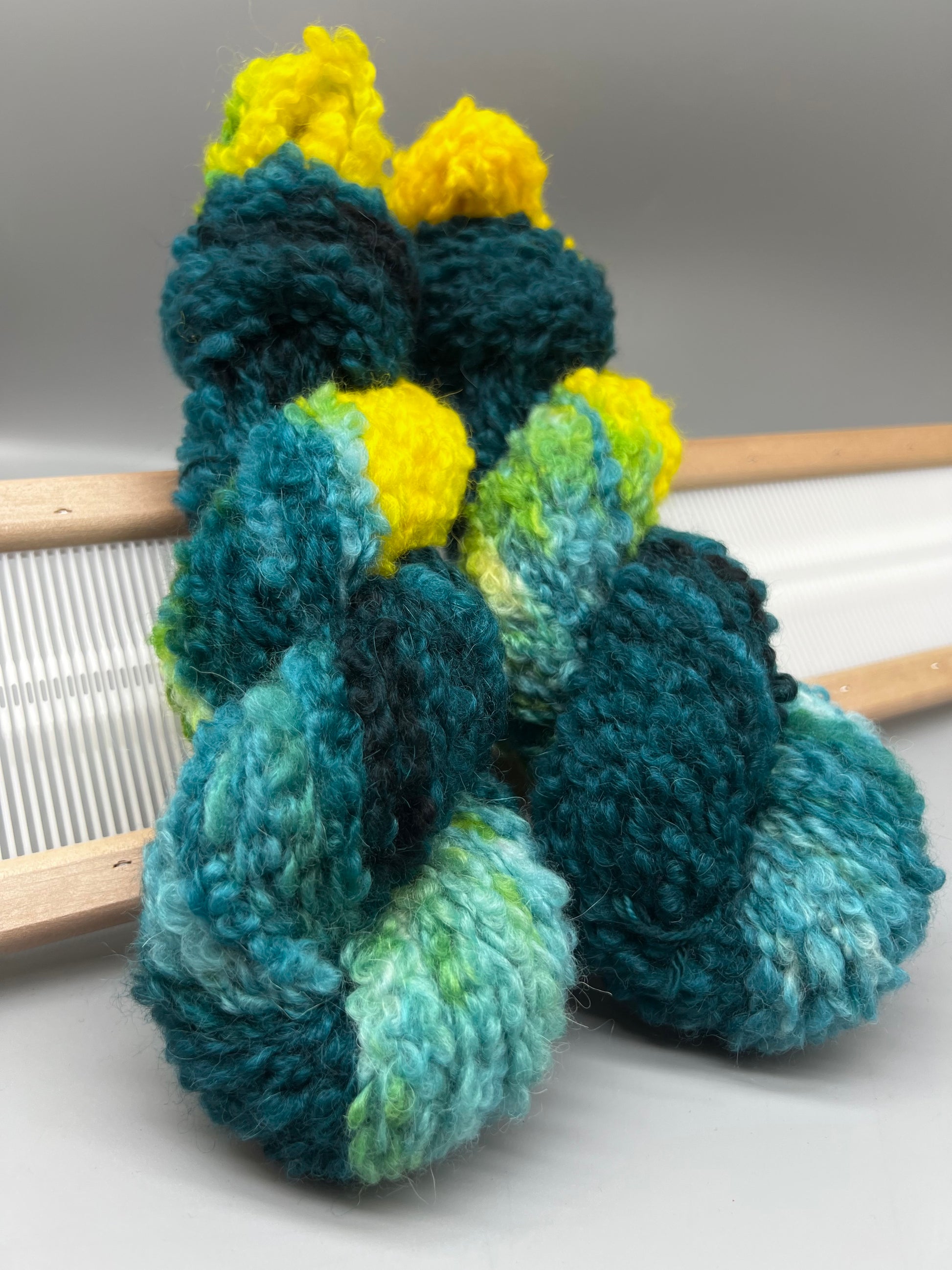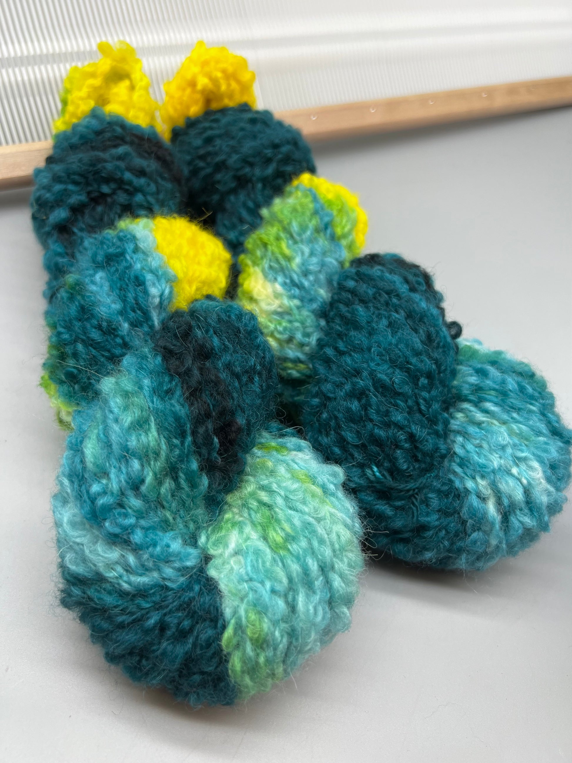 Soft yellow fading to dark blue on a super soft and fluffy bulky boucle base.
